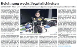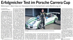 "Ein reinrassiger Sportwagen mit 3,8-Liter-Sechszylinder-Boxermotor und Heckantrieb, dazu ein sequentielles Sechsgang-Schaltgetriebe und nur 1200 kg Basisgewicht - mit dem Porsche Carrera 911 GT3 Cup, den Marc-Uwe von Niesewand in der vergangenen Woche testen durfte, betrat der Farmsener Rennfahrer absolutes Neuland. In den zurückliegenden Jahren hatte der 30-jährige Lufthansa-Projektingenieur ausschließlich mit frontgetriebenen Fahrzeugen in verschiedenen Motorsportserien sein Können unter Beweis gestellt und in 2012 mit dem Gesamtsieg im Renault Clio Cup Bohemia den vorläufigen Höhepunkt seiner Karriere erreicht. Zur Belohnung durfte er jetzt mit einem aktuellen Cup-Flitzer des Zuffenhausener Herstellers zeigen, dass er auch mit mehr als doppelt so viel Motorleistung bestens zurecht kommt."